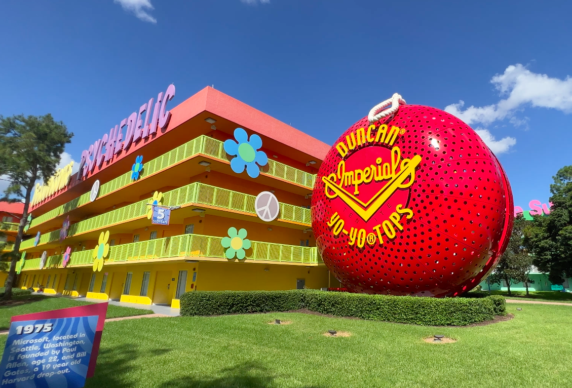 Disney’s Pop Century Resort is located is Disney’s Hollywood Studios and ESPN Wide World of Sports. It’s themed to the fads of the 1950s through the 1990s with catchphrases, toys, and dances that captivated the world through the decades. From 30 ft. tall yo-yos and Play-Doh to Rubik's Cube and rollerblades, Pop Century Resort is a fun hotel with convenient transportation options and is close to Disney’s Hollywood Studios and the ESPN Wide World of Sports complex.
