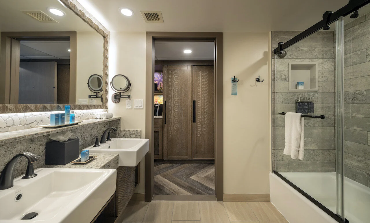 Disney Imagineers used ocean sand as the color pallet inside the bathrooms: floor tile, vanities and wall color were all inspired by different sands found on the beaches in Hawaii.