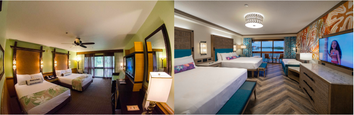 Rooms at Disney’s Polynesian Village Resort get a brighter, fresher color palette. The heavy, dark brown furniture was replaced with sleek, light wood pieces, accented with orange and aqua colors in the room. The brown carpeting was replaced with wood flooring laid out in a herringbone pattern that not only adds style, but reflects light.