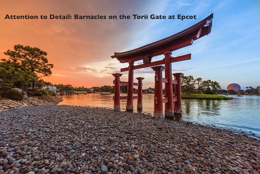 To give the illusion that this is an authentic torii in Japan, Walt Disney Imagineering has clever created barnacles on the base of the gate, just like the one it was modeled after: Torii de Miyajima. Of course, this is World Showcase Lagoon in Epcot, a freshwater, man-made lake where barnacles wouldn't naturally exist. These small, but important details tell a visual story that immerses the guest into a specific time and place - Japan. Most people might not consciously "see" the barnacles, but they do see them collectively with all of the other details. Combined, the details add up to tell a visual story. So, for a brief moment, they feel as though they really are in Japan.