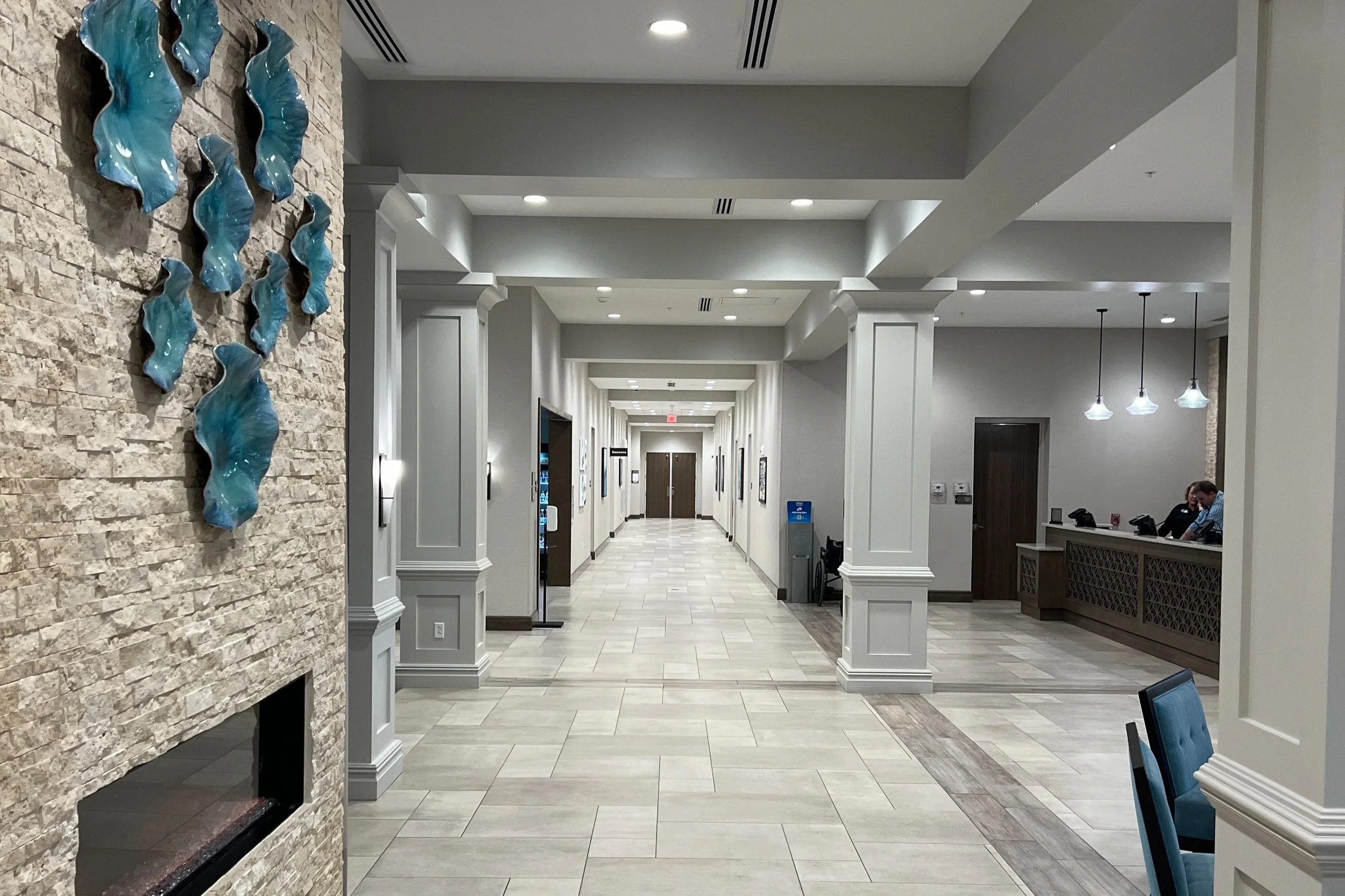 Offers studios, king bed suites and 2 queen bed suites. This hotel is connected to Home2 Suites and some of the amenities are shared.