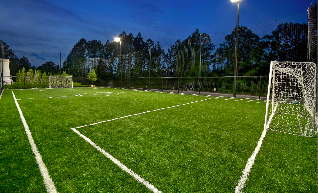 The pool, basketball court, and soccer field are located behind the hotel. The pool offers lounge seating, umbrellas, a water slide, and a pool bar.