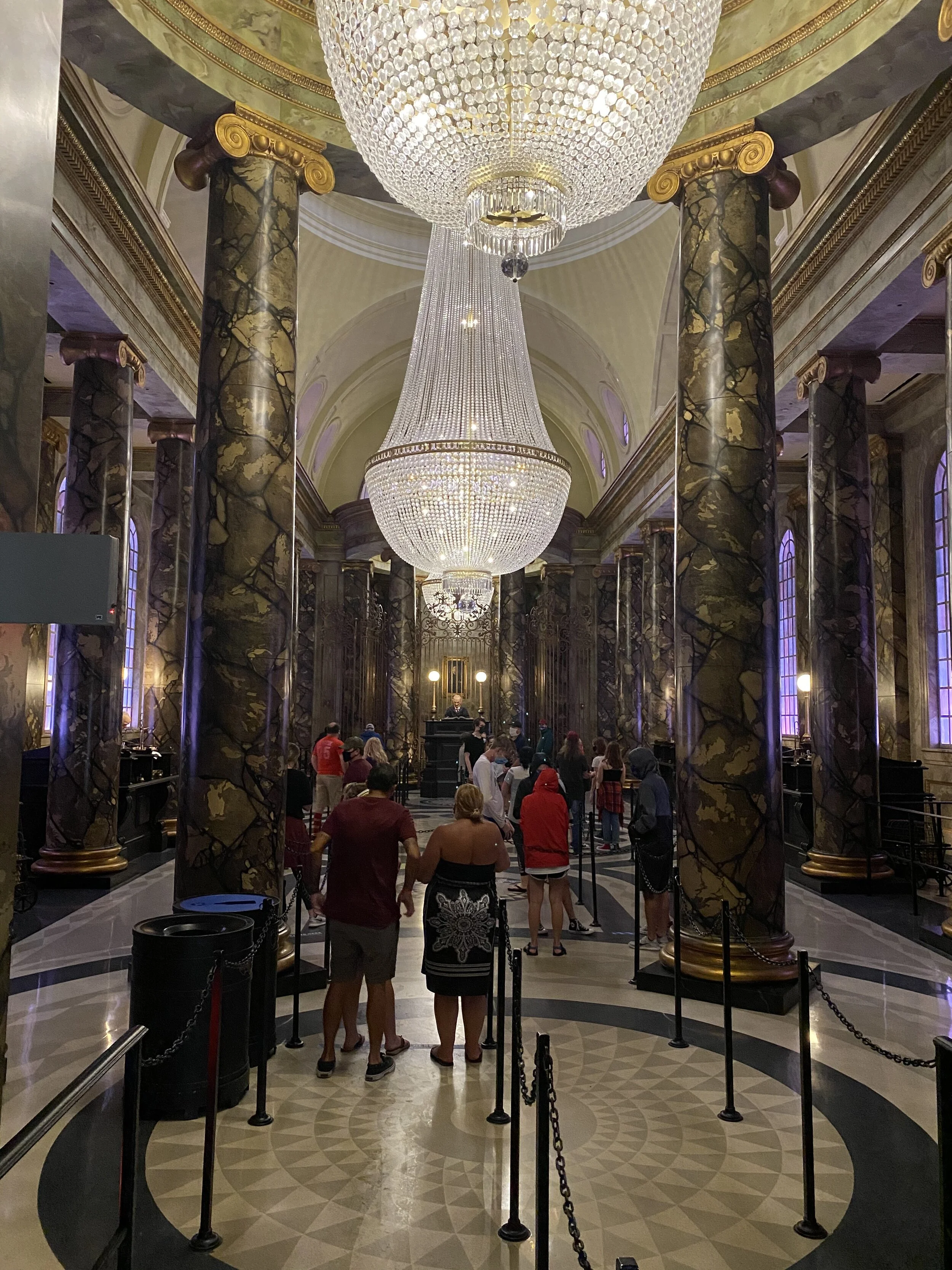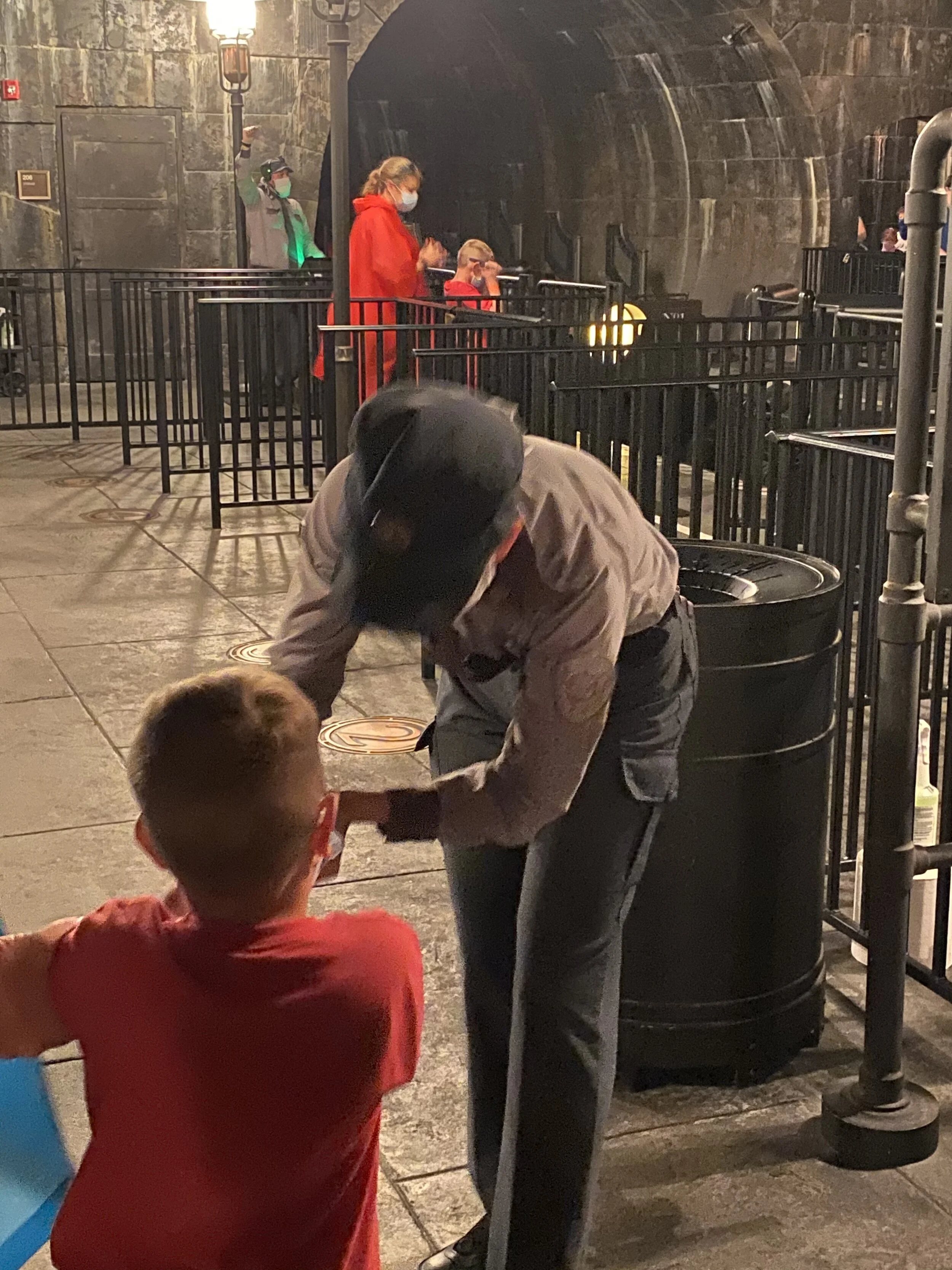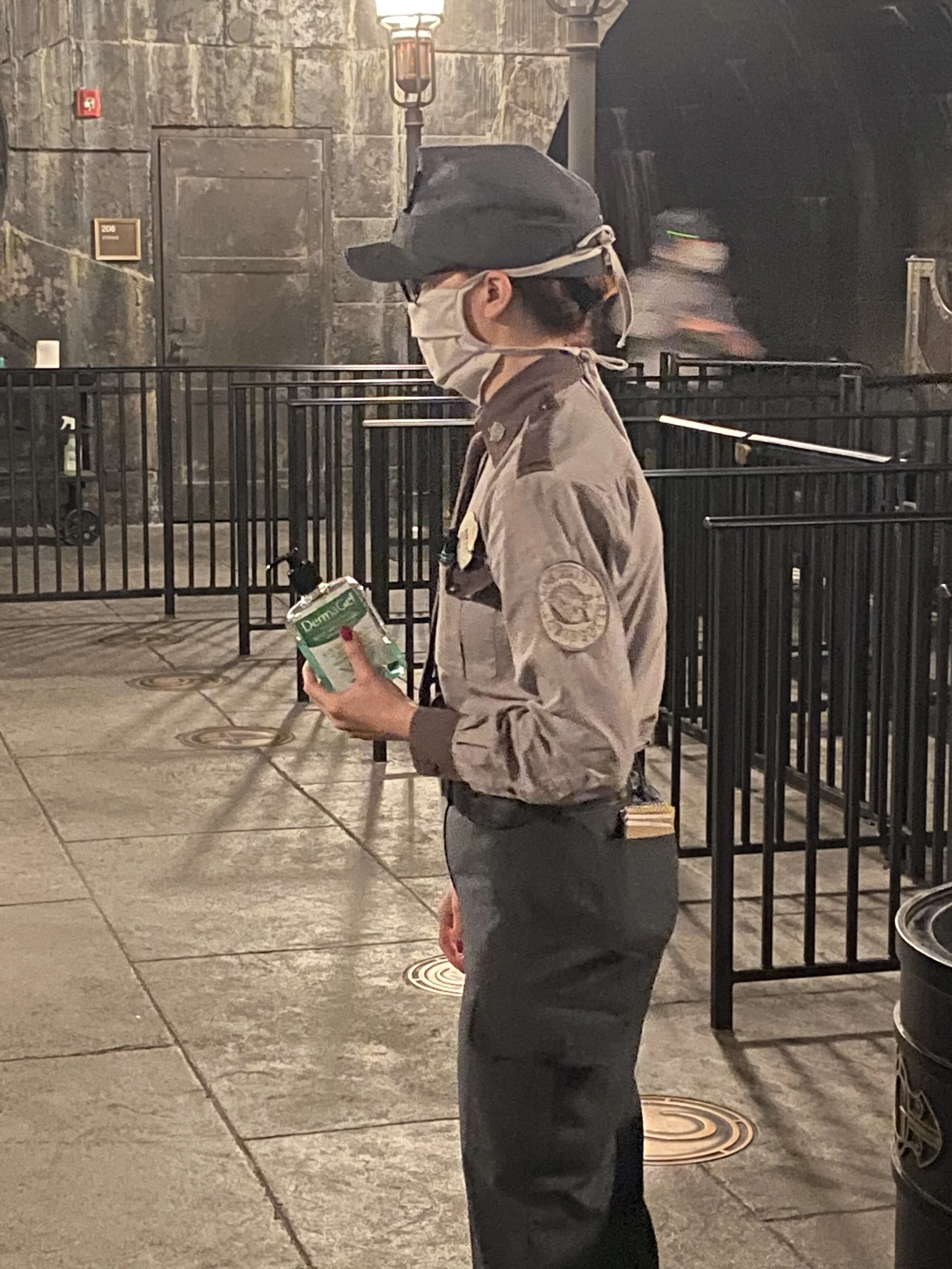 Every attraction at both Islands of Adventure and Universal Studios have blue floor markers that help guests visualize where to stand. It’s amazing how many of them there are, I couldn’t help but think how long it must have taken to measure and tape them down. These markers even take into account switchbacks. So, not only are you 6ft. behind the group in front of you, but you’re also spaced appropriately from those alongside of you. This is no joke here, Universal thought of everything.