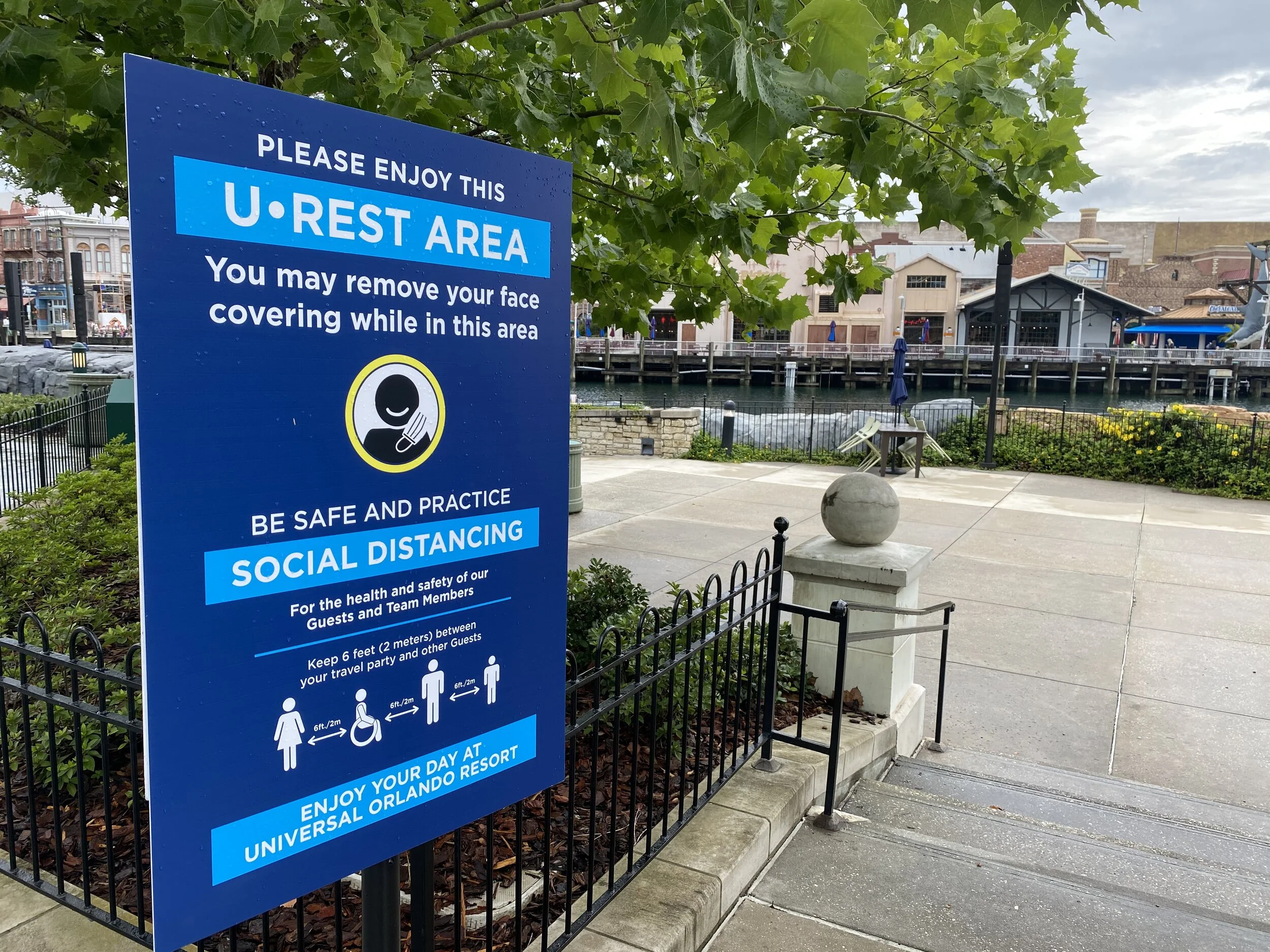 If you need a break from the mask, Universal has designated areas where you’re allowed to temporarily remove it. They just ask that you stay 6ft from others while doing so in this area.