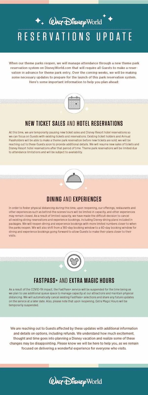 Upon reopening, theme parks, Disney Resort hotels, restaurants, attractions, experiences, and other offerings may be modified and will be limited in capacity and subject to limited availability or closure, based on direction from health experts and government officials to promote physical distancing.