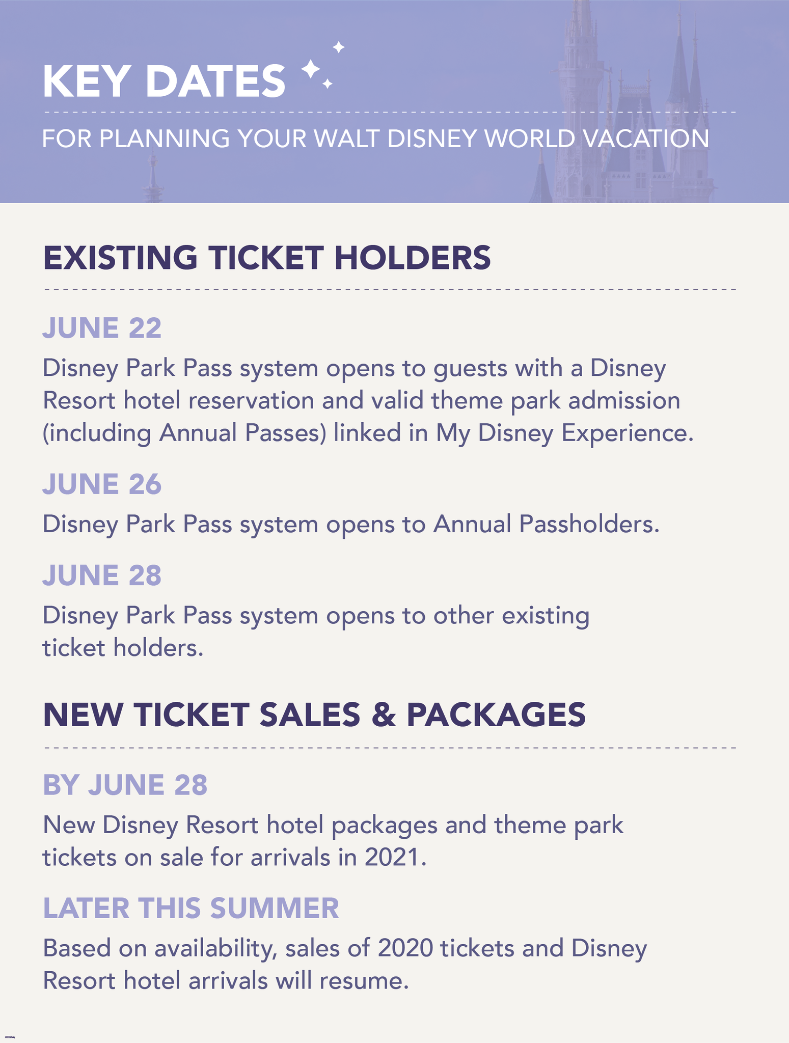 Planning a New Trip for Next Year: By June 28, all guests will be able to purchase new Disney Resort hotel packages and theme park tickets and make their park reservations for arrivals starting in 2021 as Disney’s phased reopening continues. Guests will be able to view park reservation availability on DisneyWorld.com prior to purchasing their tickets.